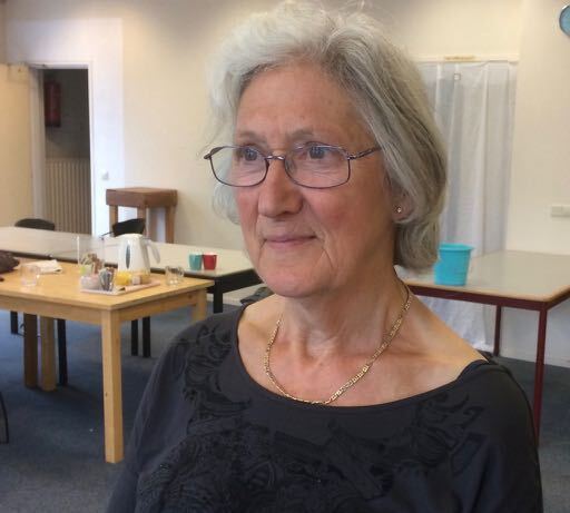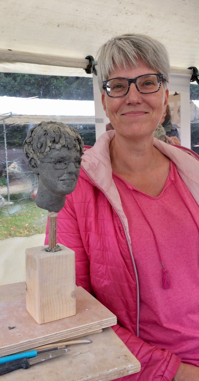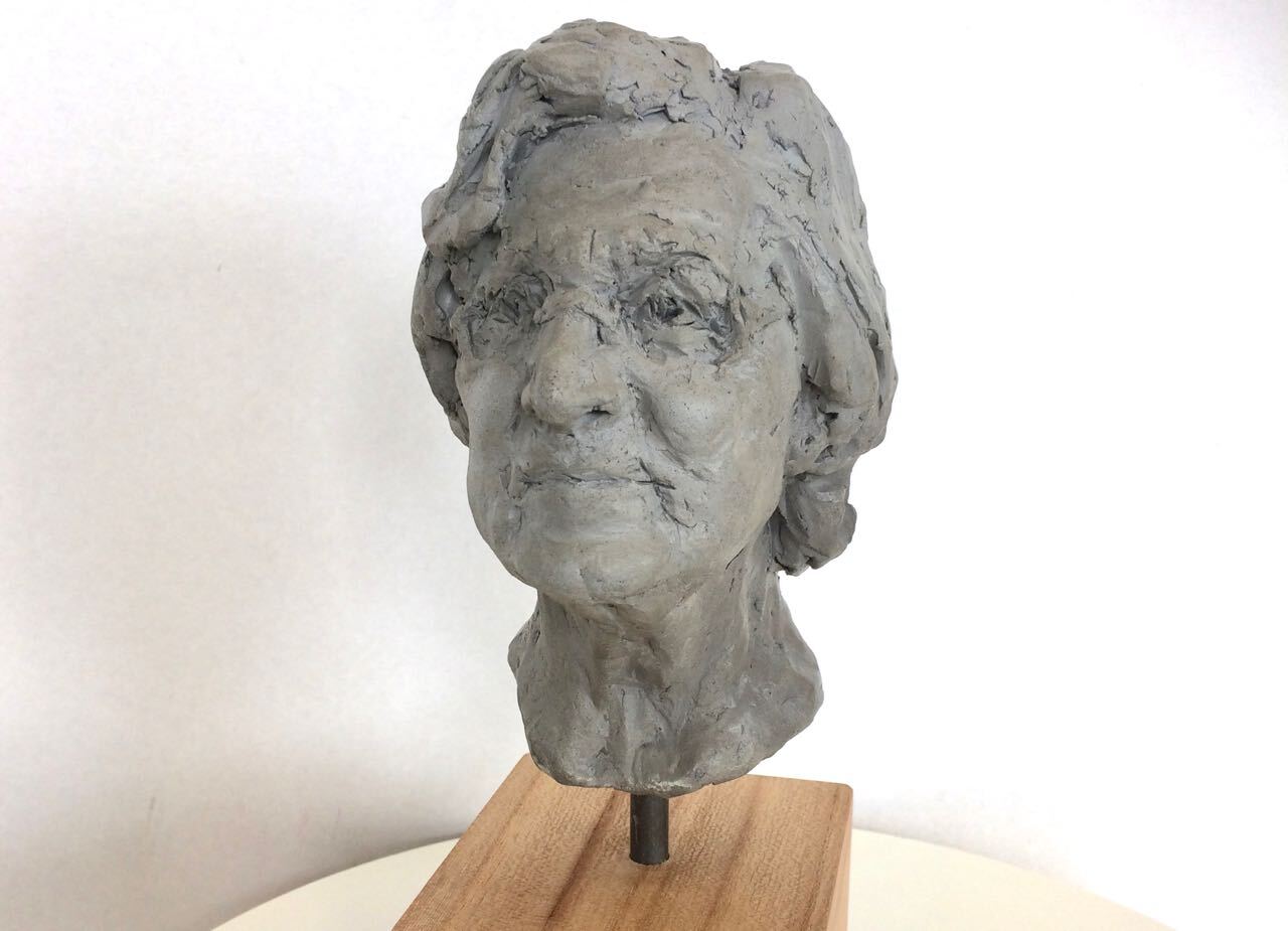 Johanna, klein keramisch portret, 18 cm, grijze fijne chamotte, sokkel iepenhout 2020