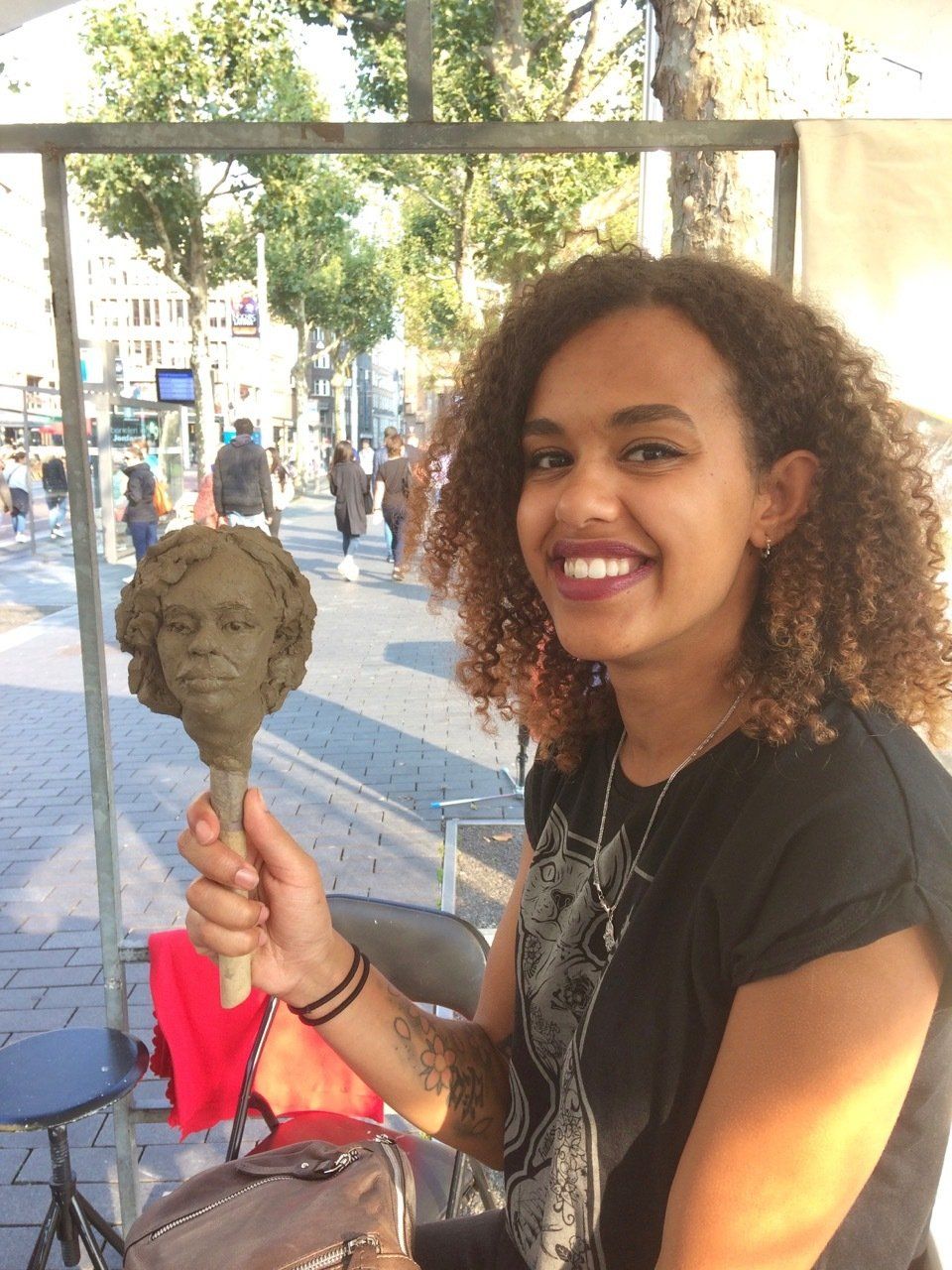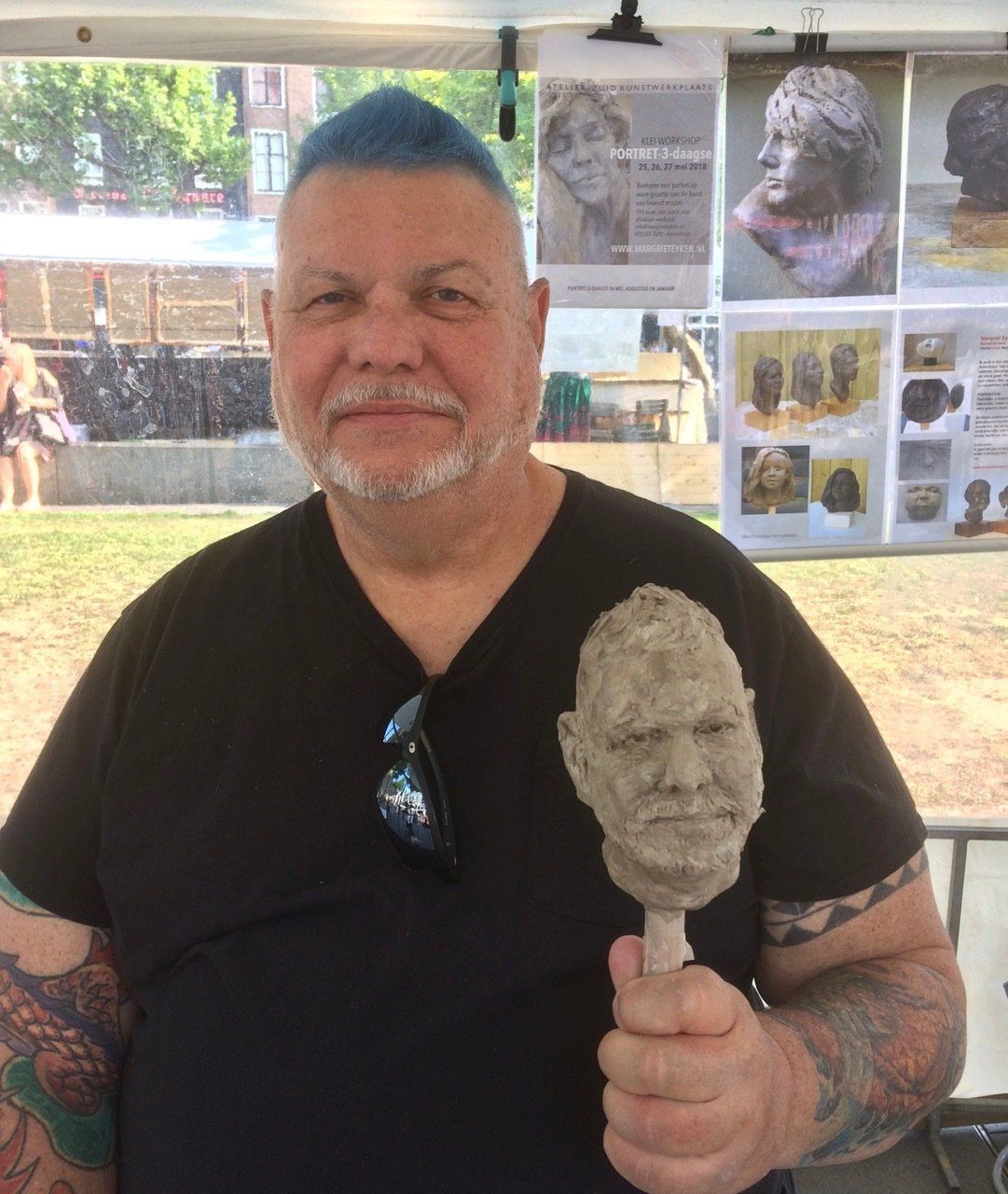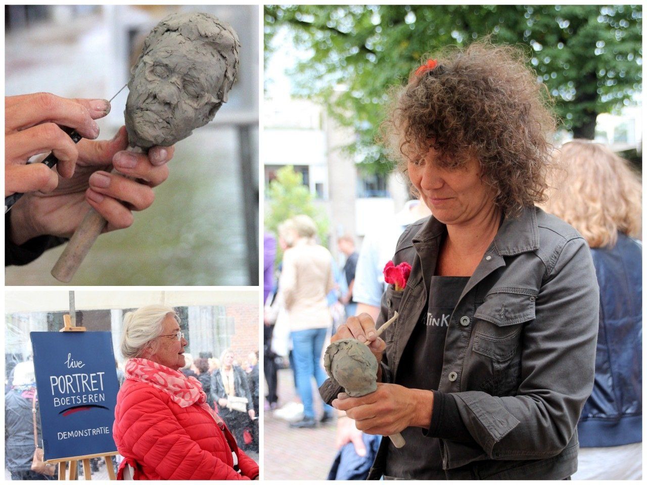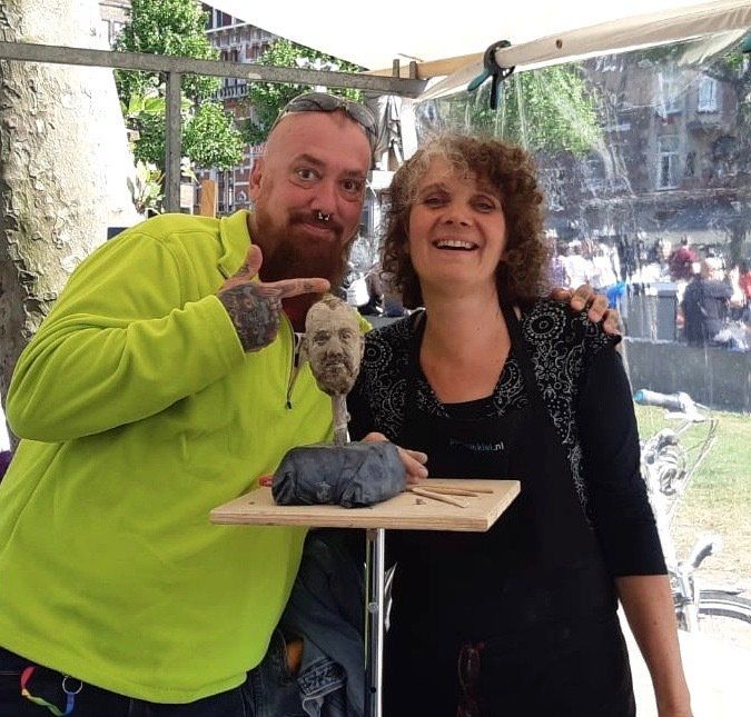 Portretboetserenop keramiekmarkten, festivals, de artmarket in Amsterdam, tijdens exposities en in het atelier. Van een snelle kleine portretschets tot grote expressieve portretten in de open lucht geboetseerd. Er ontstaan mooie gesprekken terwijl ik boetseer en prachtige ontmoetingen met een grote verscheidenheid aan mensen van over de hele wereld.